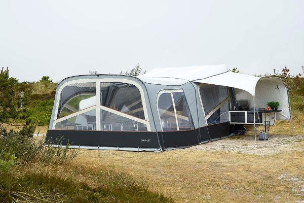 Passion solsejl tilsluttes med lynlås til teltvognen og giver rig mulighed for skygge og ekstra overdækket opholdsrum. For læ lynes siderne med gardiner nemt i.
