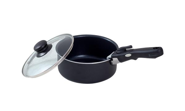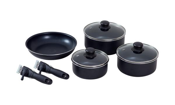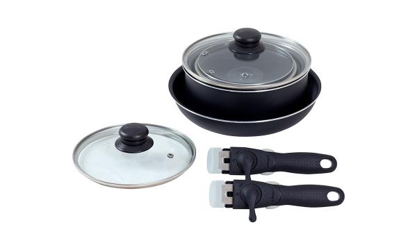 Gryde- og pandesættet består af tre gryder, tre glaslåg, én pande og to aftagelige håndtag. Det kan nemt stables og fylder minimalt, når det ikke er i brug. Bunden på gryderne og panden fordeler varmen jævnt, så du får det bedste resultat med lavt energiforbrug. Glaslågene har dampventiler og varmebestandige plasthåndtag for sikker betjening. Sættet kan bruges på induktion, gas og keramiske komfurer.