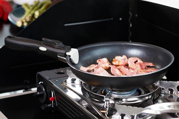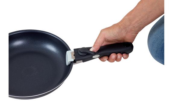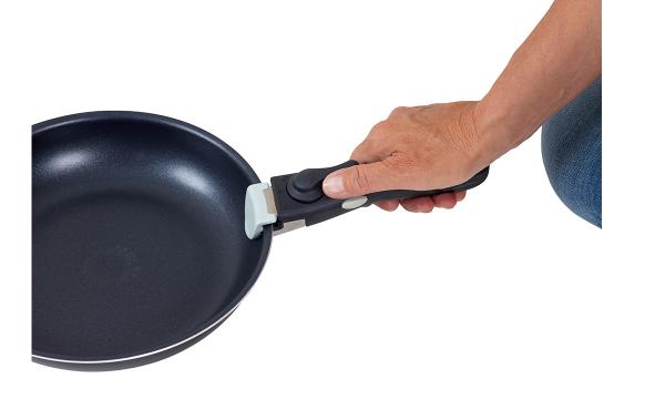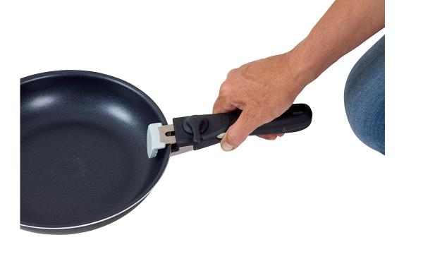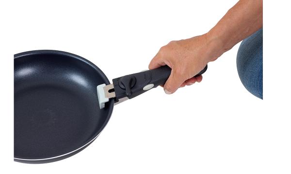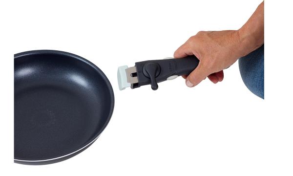 Håndtagene er lette at montere ved at dreje låsen til siden. De er udstyret med en dobbeltsikring, der sikrer, at de ikke løsner sig ved et uheld. De passer både til gryderne og panden og kan nemt skiftes mellem dem.