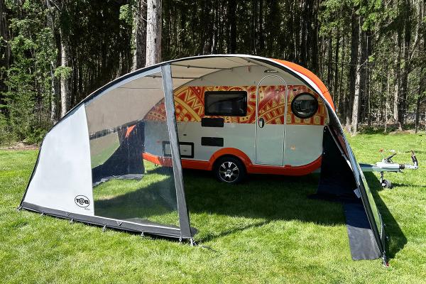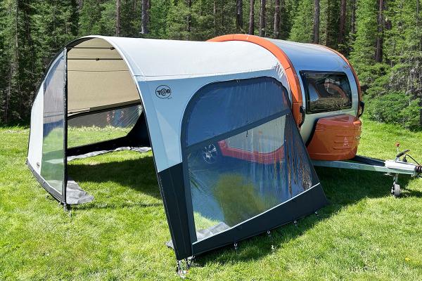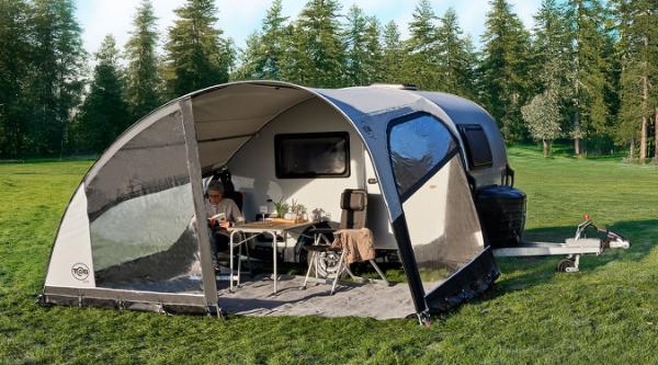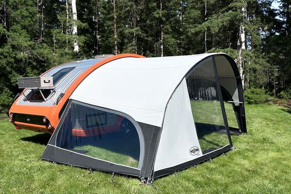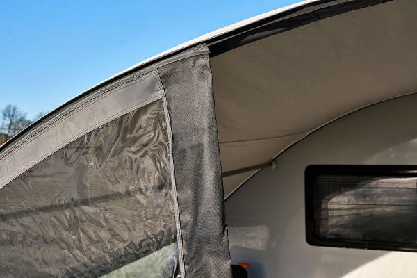 Le panneau avant est fabriqué en polyester enduit et en PVC, ce qui le rend facile à nettoyer et résistant à la saleté et aux rayons UV. L'armature de soutien incluse est faite d'une armature en fibre IXL, qui est à la fois solide et légère - idéale pour les campeurs itinérants. Nous vous recommandons de toujours utiliser le cadre de support.