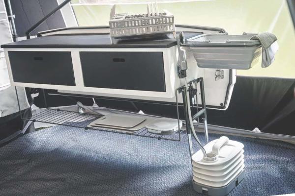 Sous le plan de travail, vous trouverez deux compartiments de rangement spacieux et une étagère qui sont parfaits pour garder votre vaisselle et vos ustensiles de cuisine organisés et facilement accessibles. La cuisine comprend également un réservoir d'eau pliable de 10 litres et un bol à vaisselle pliable, qui prennent tous deux un minimum de place pendant le transport et le stockage. Pompe à eau électrique avec robinet et pomme de douche, qui se recharge par USB, pour être sûr d'avoir de l'eau pour la vaisselle et la douche.