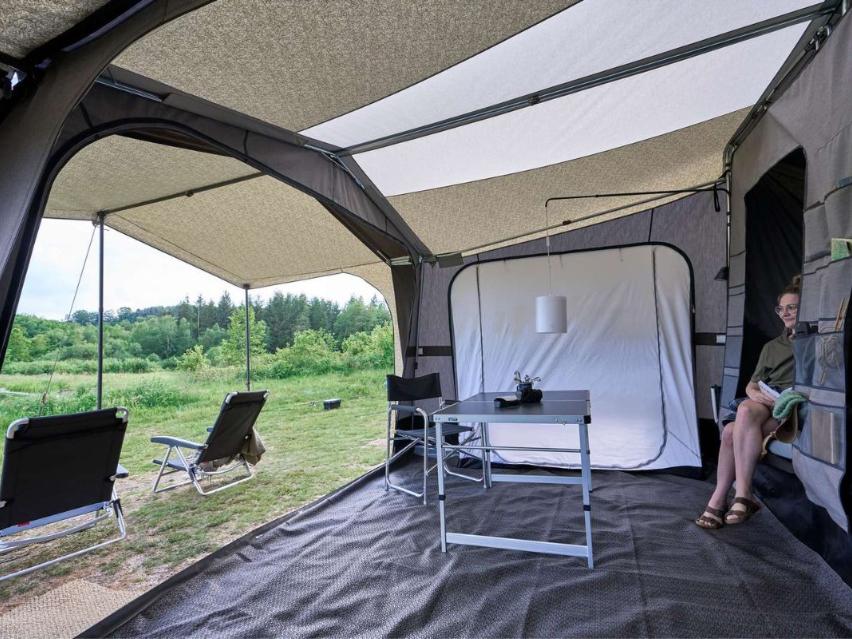 La tente Camp-let Earth est équipée de fenêtres sur tout son pourtour et offre de bonnes possibilités d'aération. La porte avant située sur le côté droit peut être roulée sur le côté pour une ventilation supplémentaire ou une ouverture permanente de la porte.