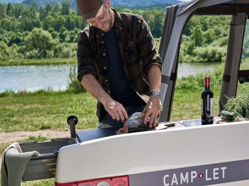 Le hayon du Camp-let Earth n'est pas équipé de série d'un module de cuisine, mais vous avez la possibilité d'acheter un pack de cuisine. Tous les modules de cuisine peuvent être pivotés et sortis de la tente pour vous permettre de cuisiner à l'extérieur. Pour votre cuisine en plein air, vous pouvez acheter une Earth tente latérale pour vous abriter de la pluie et vous faire de l'ombre au soleil.