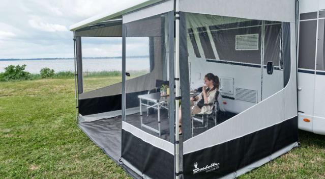 Buddy es un avance duradero y elegante diseñado para su montaje en el toldo enrollable de una caravana. Proporciona espacio y sombra en el exterior de la caravana.