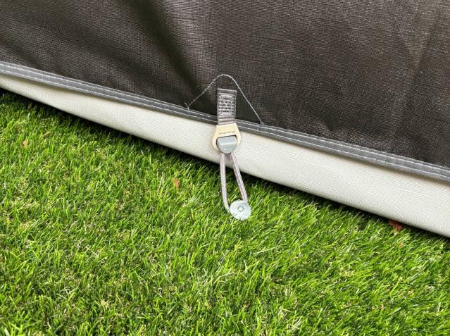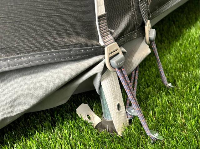 Las correas de ajuste en las esquinas del toldo te ayudan a ajustar la distancia al suelo y a tensar correctamente tu toldo. Estas correas de ajuste garantizan una tensión firme, incluso en terrenos irregulares.