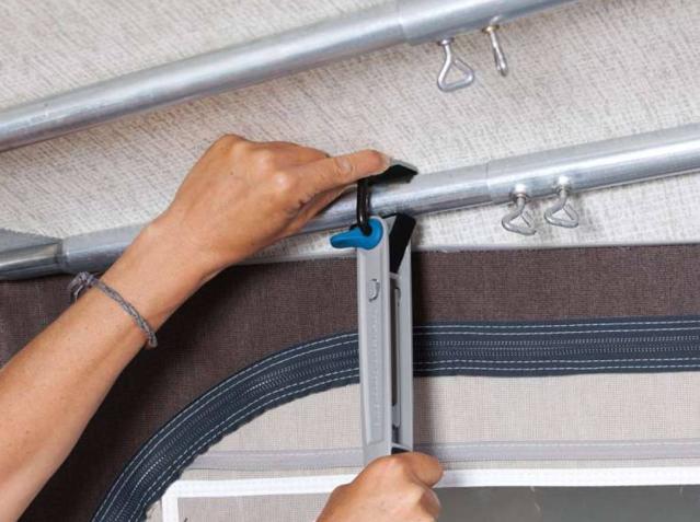 El soporte FixOn sin tornillos para caravanas garantiza que pueda tensar el mástil del techo sin taladrar agujeros en su caravana, evitando que la humedad y el agua dañen la caravana. El soporte se fija a un perfil FixOn que forma parte integral del toldo, lo que le permite colocar y mover el mástil del techo según sea necesario.