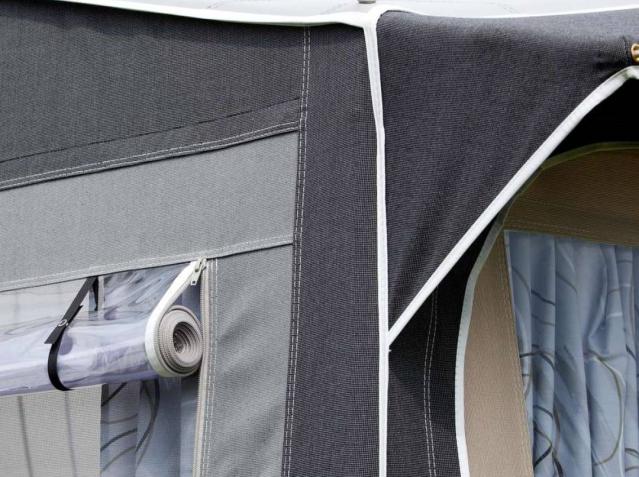 La aleta de conexión doble está diseñada para garantizar que el toldo tenga una conexión completamente estanca con la caravana. Así se evita que entren corrientes de aire, viento y lluvia en el toldo.