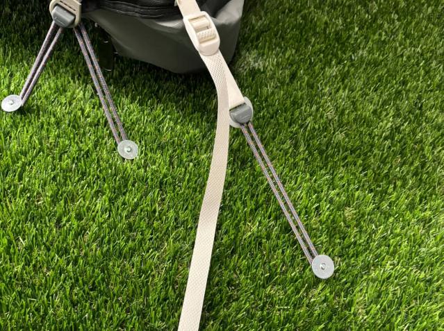 Los pies de los tubos delanteros ayudan a tensar tu toldo y a regular su altura en terrenos irregulares. El pie de una pata delantera está equipado con una argolla y dos puntos para bloquear la correa del pie en su lugar, asegurando que tu toldo esté bien tensado.