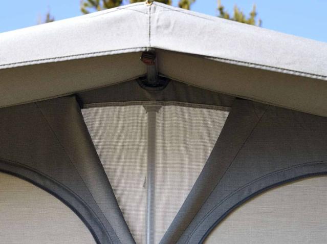 El material del techo está hecho de una mezcla de poliéster y PVA, por lo que la condensación en el interior del techo se reduce al mínimo. El PVA absorbe la humedad y retrasa los problemas de condensación. En el exterior, el techo está recubierto con 3 capas, lo que facilita su limpieza y lo hace resistente a la suciedad y los rayos UV.