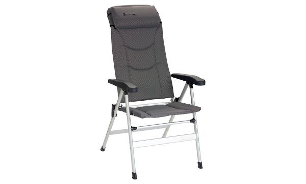 La silla Thor es un modelo acolchado de lujo con cojín para el cuello y reposabrazos, reclinable en ocho posiciones: ideal para ir de camping o descansar en el patio, tanto para comer en una mesa como para relajarse. Disponible en tres elegantes colores: gris oscuro, gris claro y azul.