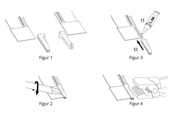 - Påfør kontaktlim der det nye stoppet skal sitte (f1), og skyv det nye på plass (f2) (se figur 3).