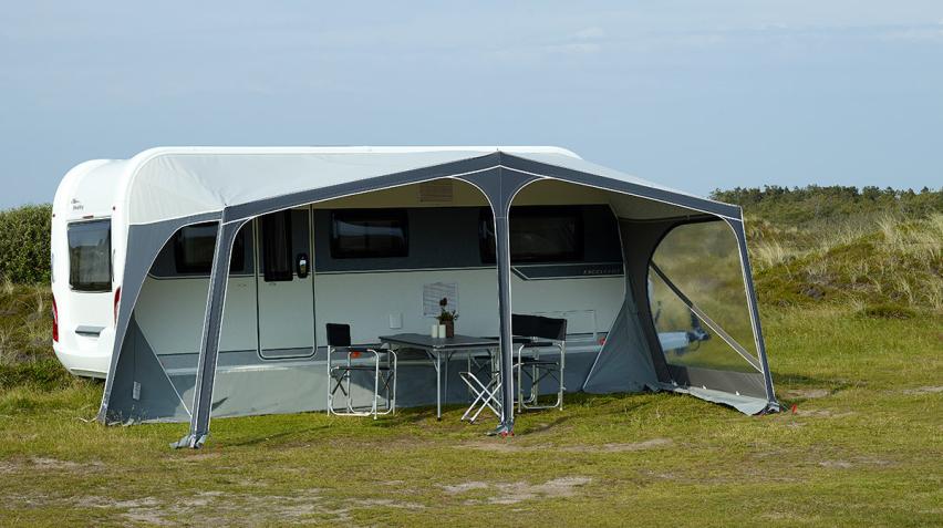 Mini Eclipse gives you a smart little covered terrace in front of your awning to provide shade inside and keep the temperature comfortable.