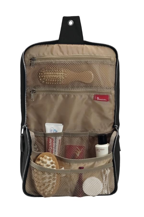 Torbę można zawiesić. Ma wodoszczelny zamek błyskawiczny i mnóstwo kieszeni na przybory toaletowe.