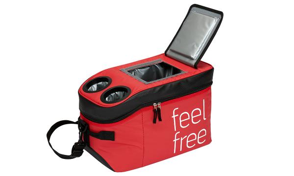 Ta elegancka torba termiczna przechowa twoją żywność i napoje w niskiej temperaturze podczas podróży. Posiada dwie opcje otwierania, dwa trzymaki na kubki, siatkę do trzymania rzeczy oraz pasek na ramię. Można albo otworzyć ją zamkiem, otwierając wówczas całe wieko, albo też otworzyć jedynie klapkę na górnej powierzchni, co pomaga po prostu wziąć coś z torby. Torba termiczna dostępna jest w kolorze czerwonym z logo Isabella na wieku oraz ”feelfree” na jednym boku.