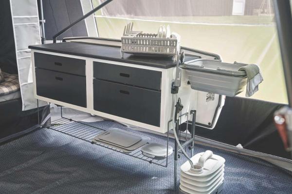Behöver du ett rymligt och funktionellt kök till din Camp-let? Basic+ köket är utformat för att du enkelt ska kunna laga utsökta måltider även när du är på resande fot. Med en stor och robust bänkskiva har du gott om utrymme för att hacka, mala och förbereda maten. Den praktiska diskhon kan enkelt fällas undan när den inte används, vilket gör det enkelt att optimera utrymmet.