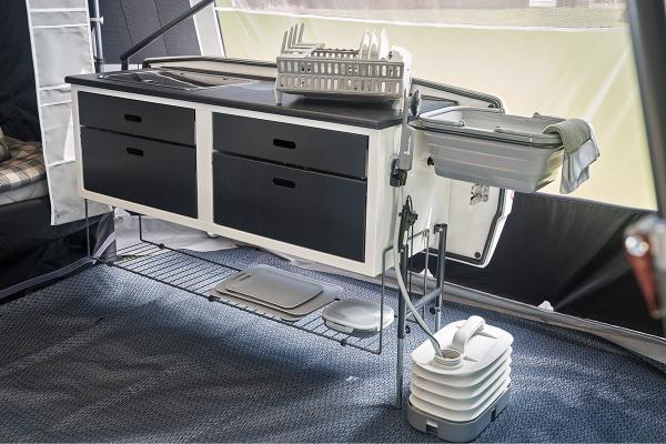 Kök Deluxe är utformat med 2 gasolbrännare. Under bänkskivan hittar du två rymliga förvaringsfack, två funktionella utdragbara lådor och en hylla, perfekt för att hålla ditt porslin och dina köksredskap organiserade och lättillgängliga. Köket har också en hopfällbar vattentank på 10 liter och en hopfällbar diskskål, som båda tar minimal plats under transport och förvaring. Elektrisk sladdlös vattenpump med tappkran och duschhuvud med USB-laddning ser till att du har vatten för disk och dusch.